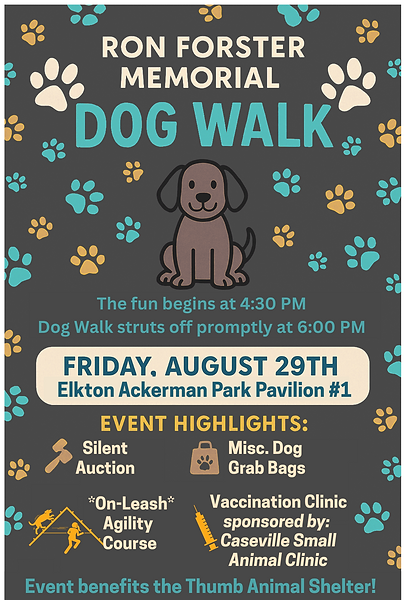 Join us in the Elkton Autumn Fest Parade on Saturday, September 2nd, as we walk as a group with dogs through the parade route wearing our Walk-a-Thon shirts!! Please be there by 10:30am, lineup will be at Saint Paul's Methodist Church of Elkton parking lot; parade starts at 11:00am sharp!!